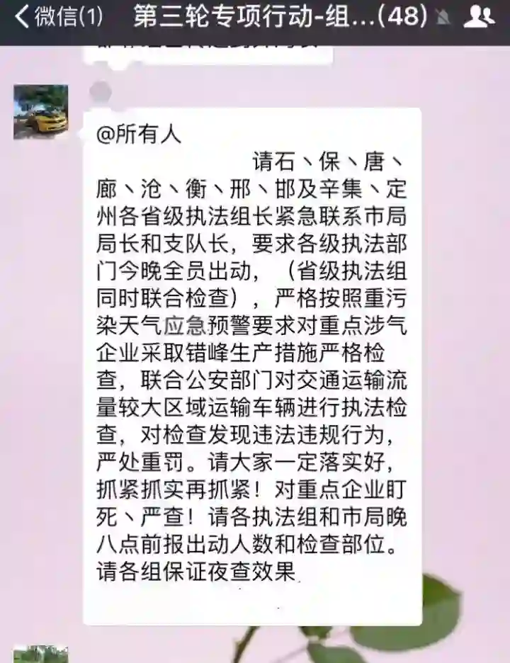 河北省环境保护厅调度各地专项执法检查组,152个执法组联合各市局执法部门,于20日晚全部出动,集体开展夜查行动,对重点涉气企业采取错峰生产措施落实情况、交通运输流量较大区域运输车辆情况等进行严格执法检查,对环境违法行为进行严处重罚。