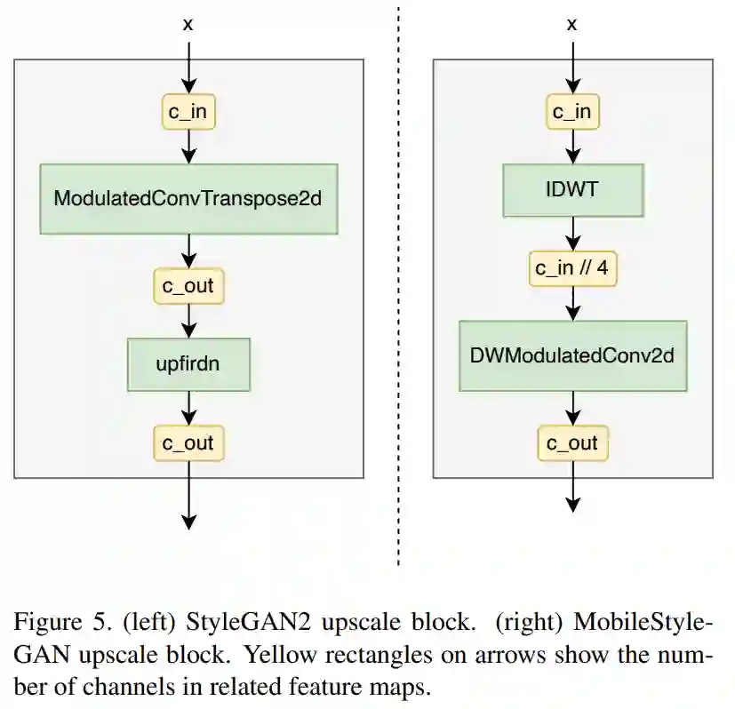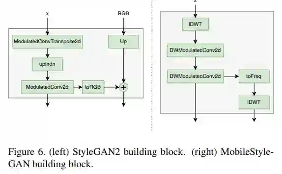 StyleGAN2 和 MobileStyleGAN 的完整构造块结构如下图所示: