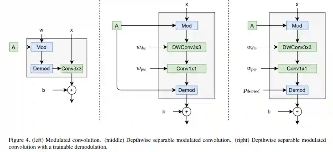 如下图所示,调制卷积包括调制、卷积和归一化(左)。深度可分离调制卷积也包括这些部分(中)。StyleGAN2 描述了用于权重的调制 / 解调,该研究分别将它们应用于输入 / 输出激活,这使得描述深度可分离调制卷积更加容易。