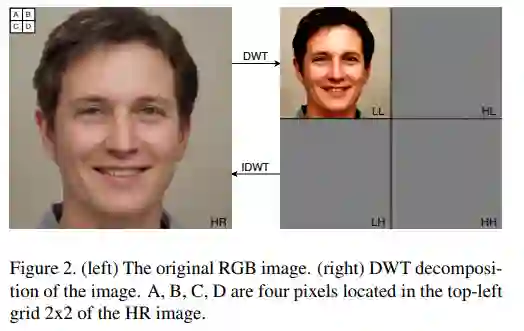 StyleGAN2 使用基于像素的图像表征,并旨在直接预测输出图像的像素值。而 MobileStyleGAN 使用基于频率的图像表征,旨在预测输出图像的离散小波变换 (DWT)。当应用到 2D 图像,DWT 将信道转换成四个大小相同的信道,这几个信道具有较低的空间分辨率和不同的频带。然后,逆向离散小波变换(IDWT) 从小波域重建基于像素的表征,如下图所示。