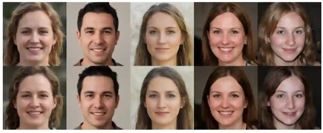 StyleGAN2(上)与 MobileStyleGAN(下)的生成效果对比。