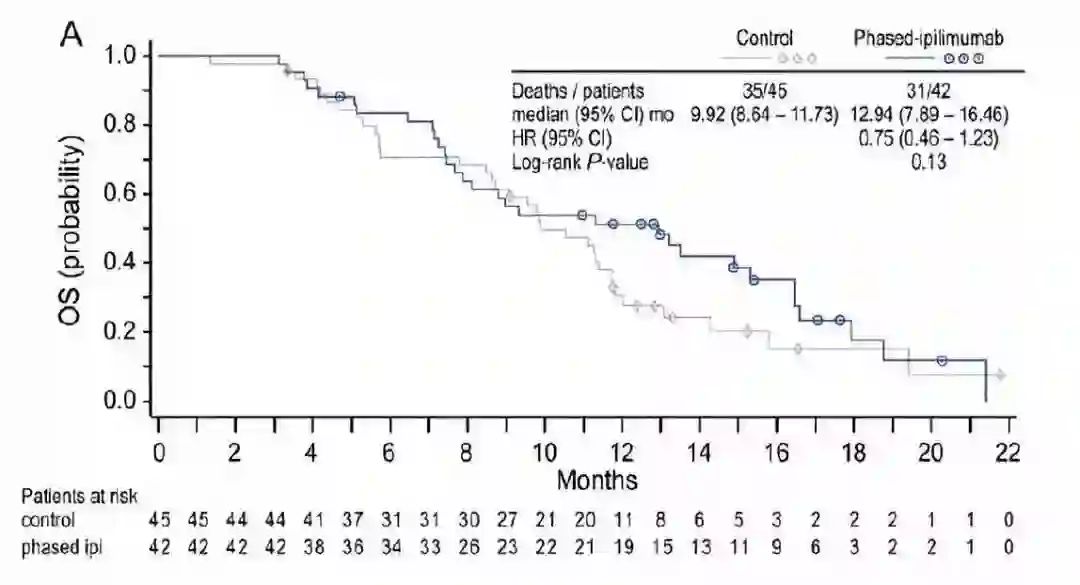 首先在ES-SCLC领域尝试的免疫治疗药物为ipilimumab(ipi)。作为首个免疫检查点抑制剂应用于SCLC患者的Ⅱ期临床研究,Reck等发表在《肿瘤学年鉴》(Annals of oncology)上的结果令人失望。该研究按1:1:1的比例分为紫杉醇+卡铂(PC)同步ipi,PC序贯ipi和单纯化疗3臂。结果表明,无论同步还是序贯ipilimumab治疗,即便是对比单纯PC方案,也没有观测到OS的获益,图1。