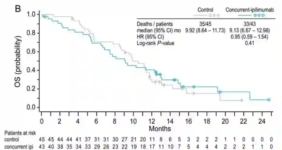 随后2016年Reck等的另一项对比ipi联合EP方案 vs 单纯化疗的临床研究也得到了类似的结果。两组的无进展生存期(PFS)和OS分别为4.6月 vs 4.4月和11.0 月 vs 10.9月,两组无统计学差异。这两个结果的公布无疑给了免疫治疗踏入SCLC领域一个“下马威”。