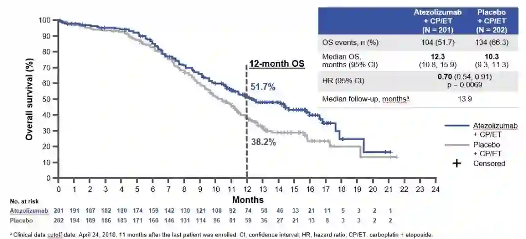 免疫治疗真正在SCLC领域掀起浪潮的两个研究来源于两个PD-L1抑制剂——durvalumab和atezolizumab。2018年的ESMO上,atezolizumab率先公布了其一线联合EC方案化疗对比单纯化疗的临床研究——IMpower 133研究的结果。该研究结果表明,一线应用atezolizumab联合EC方案化疗较单纯EC方案化疗相比,可显著提升患者的OS(mOS:12.3月 vs 10.3月; HR, 0.70 ),图3。