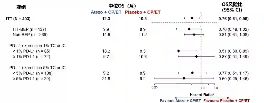 今年刚刚结束的ESMO年会上,两项研究均公布了SCLC中患者根据PD-L1表达的亚组分析数据。令人遗憾的是,两项研究均表明PD-L1表达水平不是预测SCLC疗效的有效生物标志物。在IMpower 133研究中,以PD-L1表达1%为Cut-off值的后续分析甚至得到了与预期相反的结果,图5。另外,该研究中关于肿瘤突变负荷(TMB)的亚组分析也颇存争议。所以,探索能够预测SCLC中PD-L1抑制剂疗效的生物标志物迫在眉睫。