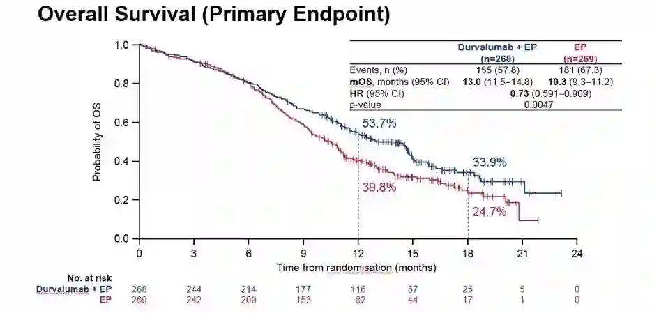 从研究设计上看,CASPIAN研究为开放标签试验,而IMpower 133研究为双盲试验,究其原因,是因为CASPIAN研究的对照组可以接受最多6个周期的EC/EP方案化疗,而实验组仅接受4周期化疗联合免疫治疗。另外,CASPIAN研究的对照组可以接受选择性的预防性全脑照射(PCI)治疗,试验组基于PCI和免疫治疗联合的安全性不确定,所以不允许患者接受PCI治疗。但IMpower 133研究中,无论试验组和对照组均接受4周期EC方案化疗,并且均允许PCI治疗。所以CASPIAN研究虽然无法进行双盲设计,但是CASPIAN研究对照组的入组标准更为宽泛。