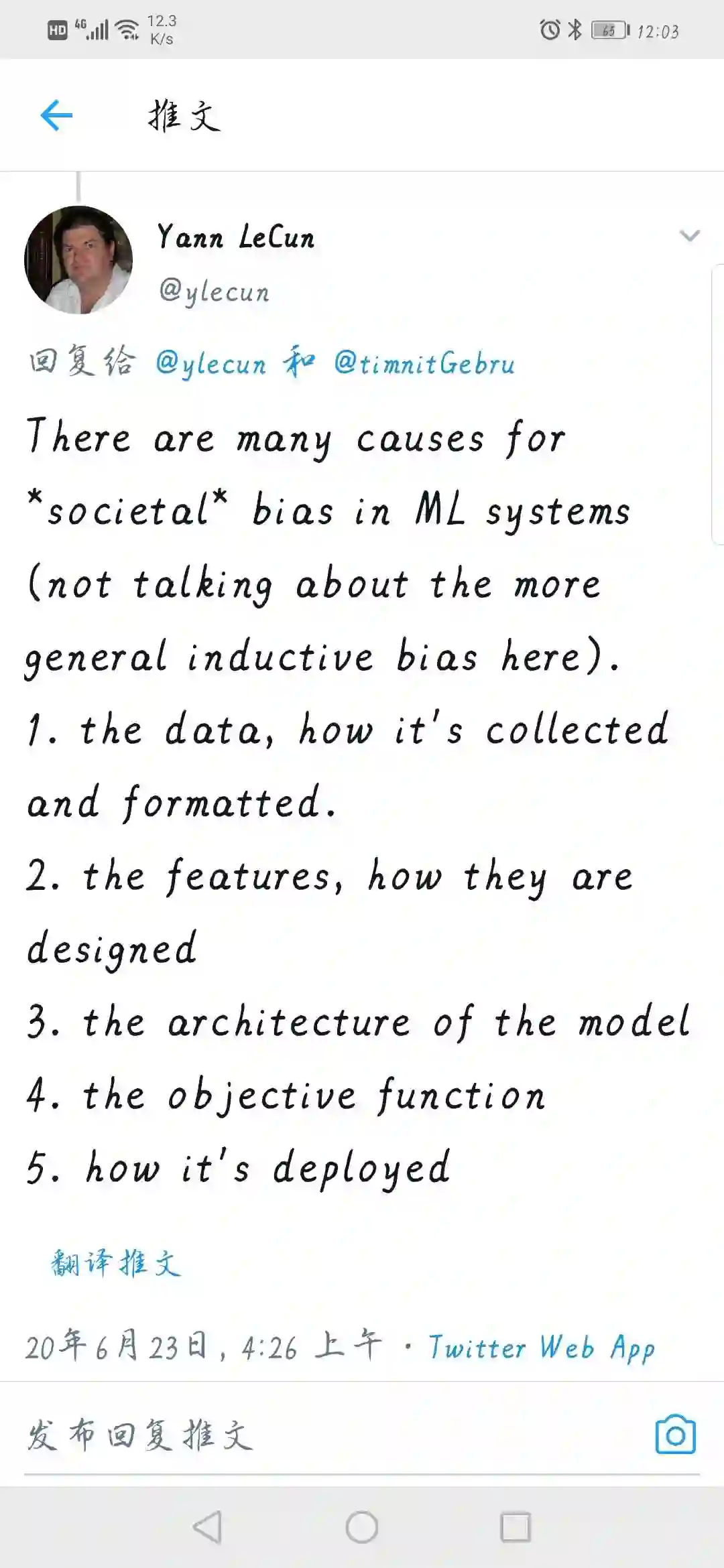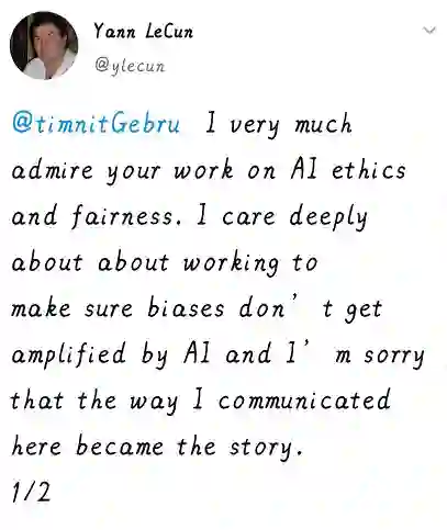 就是这样一句话引起了争议,有人说,机器学习系统产生偏见不应只归咎于数据集,这种甩锅的做法是不公平的,还有人的原因、观念的原因,等等,最后评论区的声音很快偏离轨道,没有多少人关心关于偏见的学术和技术讨论,而是转移到具有煽动性的种族话题讨论中, Yann 也终于疲于应对指责,发布了一条道歉推文,宣布自己从此将不再在推特发表重要观点。