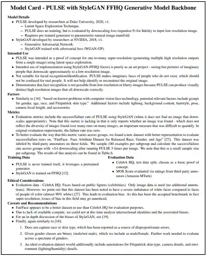 在论文中,PULSE 的作者在附录中的model card中也讨论了模型偏见,写道相比于 CelebA HQ(基于公众人物(名人)的人脸数据集),FairFace或许是评估模型时的更好选择。