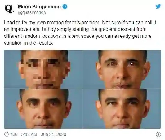 AI 艺术家 Mario Klingemann 认为,这个问题应该归结于 PULSE 算法本身,在选择像素的逻辑上出现了偏见,而不全是训练数据的问题。Mario 强调自己可以利用 StyleGAN,从相同的低分辨率奥巴马图像中生成非白人特征的图片。