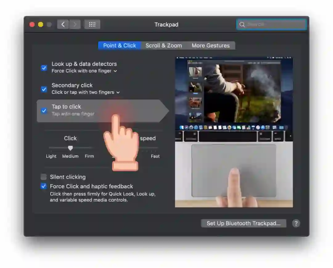 如果你刚从旧款 MacBook Air 转到新款 MacBook Air,那么你可能会在更大的触控板面积出现误触的情况。当你在使用新款 MacBook Air 上打字的时候,如果你一只手的拇指放在空格键附近,那么拇指的中间这一段很容易就接触到触控板的左上角,导致触控板误触和操作失灵。如果你深受其扰并且实在无法解决这个问题,那么不妨试试在偏好设置中关掉「Tap to Click」的选项。
