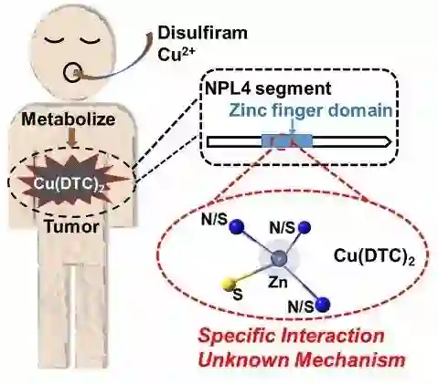 基于该工作模型反应的发现和已有文献信息,林柏霖团队提出了双硫仑广谱定向治疗癌症的首个可能的分子级别机制。首先,肿瘤组织会选择性富集铜离子,这个已经有相当多的文献证据。接下来,双硫仑会通过常规体内代谢生成DTC,在内循环中碰到肿瘤组织后,与富集的铜离子在生成强螯合共价配位键的驱动下,原位产生强疏水性的Cu(DTC)2小分子配位化合物。这一组合使铜离子不仅避免了被调控蛋白捕获命运,还拥有了直接穿透细胞膜进入细胞内的能力。接下来,Cu(DTC)2因其特殊的氧化选择性,克服了细胞内还原性保护屏障,进而通过氧化细胞内包括与被泛素化蛋白隔离有关的NPL4等蛋白在内的锌指区域的锌硫位点,诱导蛋白变性。因此,包括p97-UFD1-NPL4降解癌细胞快速增殖产生残次蛋白在内的通路被抑制,癌细胞被选择性杀死。