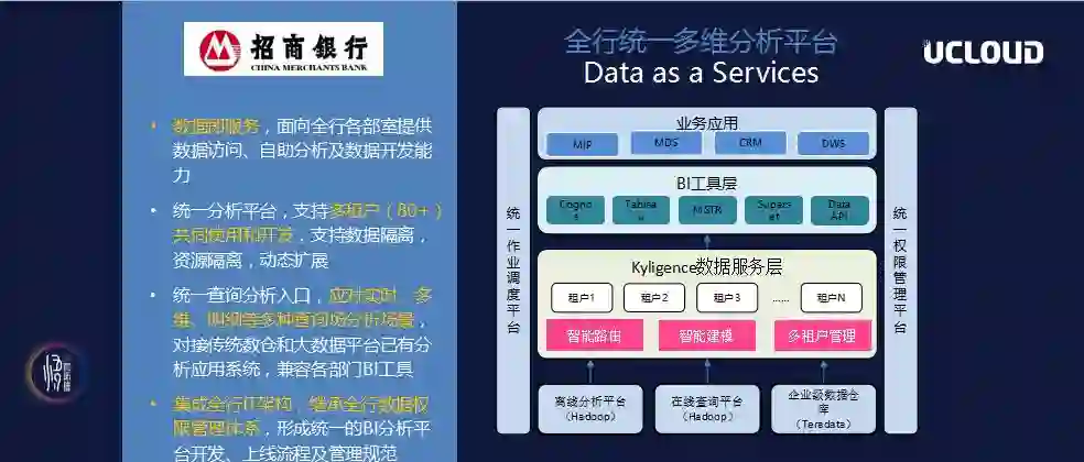 “不同的部门,例如信用卡部门、数仓部门、风控部门,数据不一致,主要是因为存在不同的平台上。如果通通放在一起就会发现,都放入Teradata中有点儿小贵,放在GreenPlum中并发度又不够,如果向Hadoop平台做迁移,作为全公司统一的数仓平台,分析的语义层模型能不能统一也是个问题。所以用麒麟做成一个统一的数据服务层,上面对接传统招行中使用的BI工具,包括Cognos、MSTR、Superset等,如此就形成了整个招商银行内部,80多个不同的部门使用的统一场景架构。”