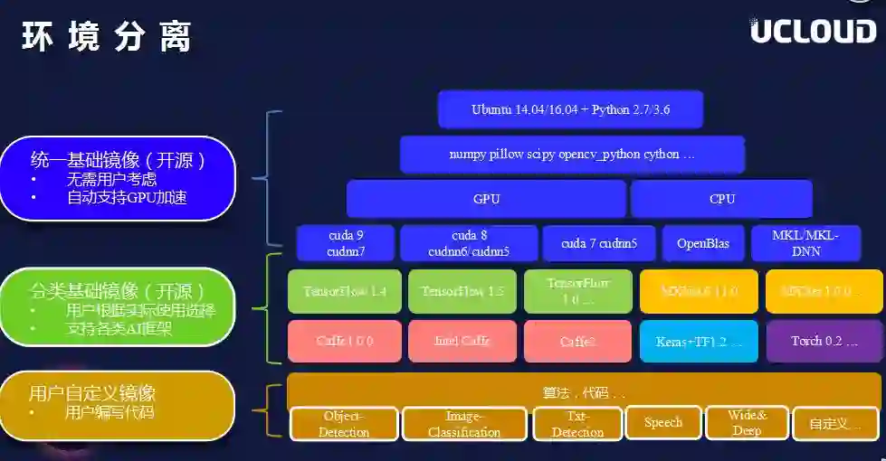通过Docker技术实现运行环境的逐层分离:统一基础镜像层,负责存储操作系统、驱动、依赖库;分类基础镜像层,负责针对不同深度学习框架进行打包存储;用户定义镜像层,开放给用户编写自己的AI代码。通过这样的分层管理,镜像可以做到很好的预装、定制、重用、兼容的特性,以此满足第一个需求挑战“算法兼容性”。