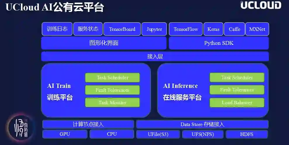 接着,她详细介绍了UCloud关于基础平台架构的很多技术干货。在整个AI 平台架构中,中间层是训练平台和在线服务平台两个基础平台,他们都拥有错误处理、负载均衡等功能;底层部分通过计算节点接入层兼容了各种异构的计算节点,如GPU、CPU; 在存储方面通过统一的接入层,让各种类型的存储介质接入平台后,面向开发者们访问方式都会像本地访问一样简单快捷。由于不同的用户有不同的使用习惯,例如有的用户可能习惯图形化的接入,因为直白,所见即所得;而有的用户需要与自己的内部系统做连接,所以迫切要求SDK做全自动化的脚本介入等。在架构上层有一个API的接入层,做到兼容各类用户访问需求。图形化界面方面,支持训练日志、服务状态、TensorBoard图表,Jupyter Notebook等实时交互方式。SDK方面,兼容主流深度学习框架,例如TensorFlow、Keras、Caffe、MXNet。
