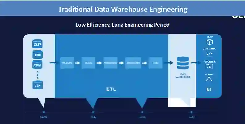 关于“数仓是如何建设的”问题,他在演讲中也有详尽提及。过去,传统数仓的建设需要从很多系统中读取数据,例如OLTP、ERP、CRM系统等,其中会涉及到很长的流程,还需要保证数据的整合、清理、过滤、语义一致性以及保持模型层的完整,最后的环节才是导入一个数仓中,然后对接整个前端的应用需求。