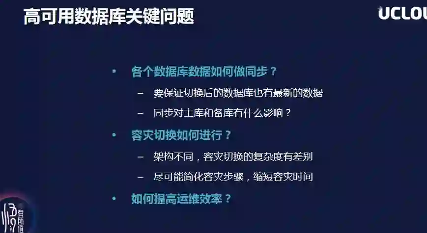 开放式的精彩分享仍在继续,在有关“数据库高可用容灾方案设计和实现”的分享中,UCloud云数据库的资深研发工程师丁顺,对传统数据库服务与高可用数据库进行了对比。