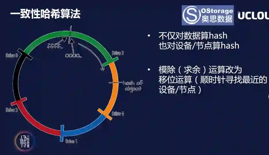 另外很重要的一点,一致性哈希算法是最基础的,它构成了现在分布式存储数据分布的基础算法,数据怎么找到它的存储位置?算哈希匹配,这样能够极大的提高效率。换句话说如果采用查表的方式,Objecto的数量太多了,查表的负担非常大,存储开销非常大,一致性哈希算法不用查表。