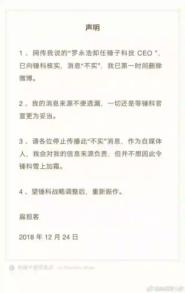 智东西12月24日消息,微博“扁担客大叔”今日删除爆料微博并发布声明称,“消息来源不便透露,一切还是等锤科官宣更为妥当。请各位停止传播此“不实”消息。”该微博此前爆料称,罗永浩卸任CEO并开始遣散各省级分部的人员。对此,锤子方面回应称未听说。