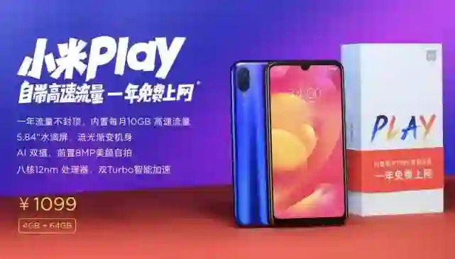12月24日,小米手机新品类“小米Play”正式发布。这是小米发布的首款水滴屏手机,采用1080P屏幕,主摄像素1.25μm,首推芯片CPU+GPU的双Turbo技术,支持AI人像模式,采用了12nm制程的CPU,主频最高达2.3GHz。该机采用自带流量模式,购机后一年之内流量不封顶,内置有每月10G的4G高速流量,用户在使用完高速流量后,可继续免费使用流量无限制的3G网络。