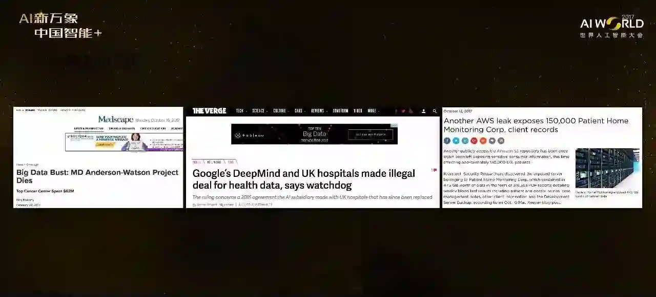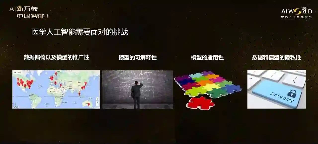 这里数据维度和异质性就不讲了。还有数据偏倚,比如沃森只能在美国病人群体上用,在菲律宾怎么用?还有模型的可解释性,我们用深层学习模型去预测皮肤癌,但结果皮肤科医生不敢用,因为医生需要知道是由于出现哪些特点,才导致了这样一个预测结果,模型的解释性要强。还有模型的适用性,前面说了,AlphaGO Zero的优势在于不需要数据,它的规则非常清晰,但医疗领域没有那么清晰的规则。还有隐私性,有学者在专门研究怎样在不泄漏任何隐私的条件下做医疗分析。