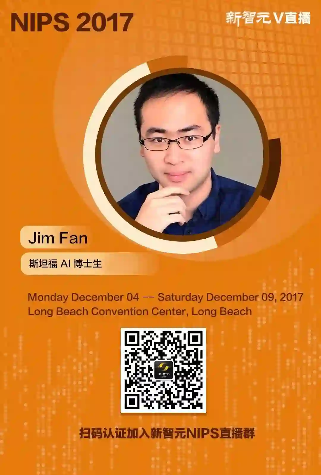 NIPS 2017,新智元智库专家、CMU计算机学院副教授马坚老师和斯坦福大学AI博士生Jim Fan将在美国长滩带来现场直播,关注新智元小程序或扫描下方二维码加入直播群,参与直播互动,第一时间了解NIPS前沿资讯。