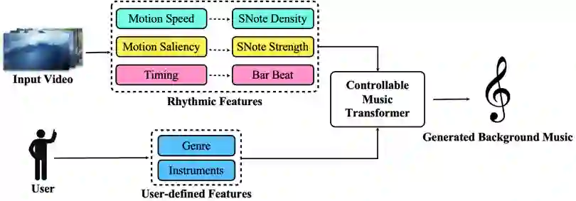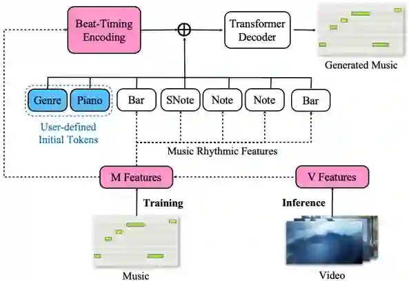 视频是记录生活、表达观点、娱乐消费的绝佳媒介。近年来,越来越多的人开始拍摄和制作视频。为使视频更具吸引力,人们通常会给视频配上背景音乐,但这通常会花费大量时间,以挑选合适的音乐,并对视频素材剪辑,使其与音乐的节奏契合,还可能遇到音乐版权问题。因此,为视频生成背景音乐成为一个具有广泛应用前景的任务。但在此之前,尚未有针对这一任务的有效研究结果。虽然在音乐生成领域已经有了一些研究工作,但这些工作均未考虑视频信息。为了解决这个问题,我们提出一种新的音乐表示形式,并基于这种表示形式设计了音乐生成模型,实现了较好的视频背景音乐生成效果。