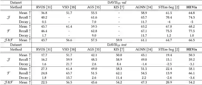 本文分别在视频实例分割(VIS)和无监督视频目标分割(UVOS)任务上做了相关实验。实验结果可以看出所提出方法获得了最优的表现,并验证了其有效性。