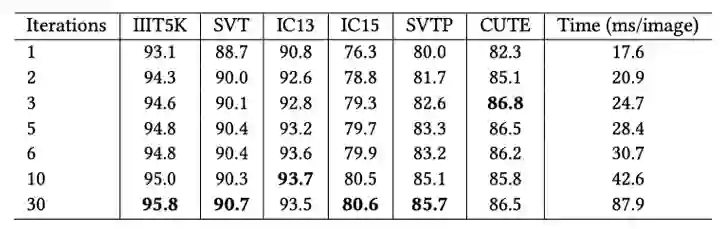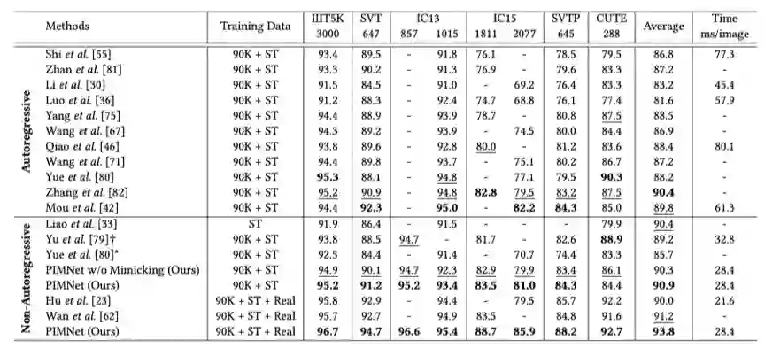 表1将PIMNet与之前的方法在准确率和效率上进行了对比。与其他非自回归方法相比,本研究提出的方法 PIMNet 在七个数据集上达到了六个最优准确率。与自回归的方法相比,PIMNet可以达到相近的准确率,同时更快的速度。
