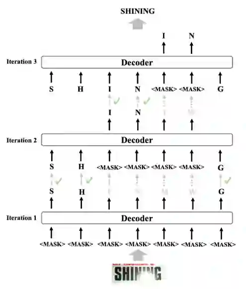 图2展示了“简单优先”策略的解码过程。在初始阶段,所有的字符预测位置设置为<MASK>占位符。在每次迭代过程中,所有标记为<MASK>的位置将被预测,并且置信度高的预测将在下一轮迭代中保留。低置信度的字符将被<MASK>替换,并将在后面的迭代中基于已获得的字符再次重新预测。