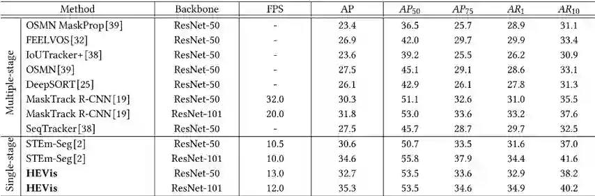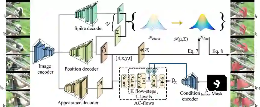 视频实例分割(VIS)涉及跟踪、分割和分类视频序列中的所有实例。现有的工作大都遵循判别式的检测-跟踪范式。然而,这些方法并不是端对端、可训练的,需要设计和微调多个独立的子模型,这种解决方案即繁琐,其计算代价也十分昂贵。并且由于视频中存在着天然干扰因素,如低分辨率和运动模糊,这些方法经常无法鲁棒的定位到新的实例。本文从以下两个方面着手解决这些问题:(a):本文提出了一个层次化变分贝叶斯VIS框架:HEVis,在一个前向传播中跨越空间和时间来分割和跟踪实例,以学习目标和背景的有效表示;(b):本文引入一个基于因式分解的条件流(conditional flow)来细化外观特征分布,以获得每个实例更鲁棒的特征表示。
