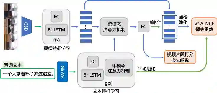 图2展示了本研究所提出的模型框架,箭头表示模块之间的数据流动方向,其中来自损失函数的梯度可以通过蓝色箭头反向传播,但不能通过绿色箭头反向传播。其中包含三个模块,包括视觉语言特征表示学习模块、时序片段候选生成模块和视觉一致性对齐学习模块。视觉语言特征表示学习模块对视频和文本采用了Bi-LSTM来学习逐帧/逐字的特征表示。文本经过Bi-LSTM的编码后,又被输入到额外的单模态多头注意力机制以增强文本的表示能力。VCA模型中用一组跨模态的多头注意力机制来学习视频片段与文本的跨模态特征表示。跨模态的特征被输入到时序片段候选生成模块生成视频片段与文本的匹配分数,并通过分数来选择与给定的查询文本相似度最高的视频片段的时间区间。然后视觉一致性对齐学习模块利用句子之间的相似性来挖掘来自不同视频的视觉相关的视频片段以构造正例样本和负例样本进行对比学习。