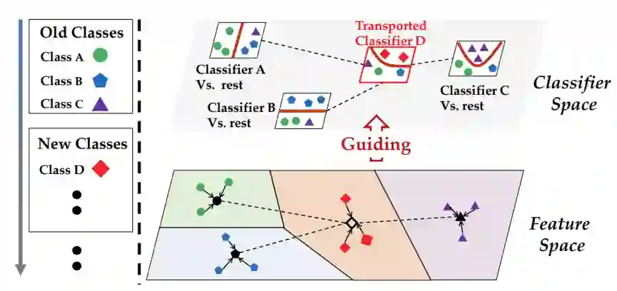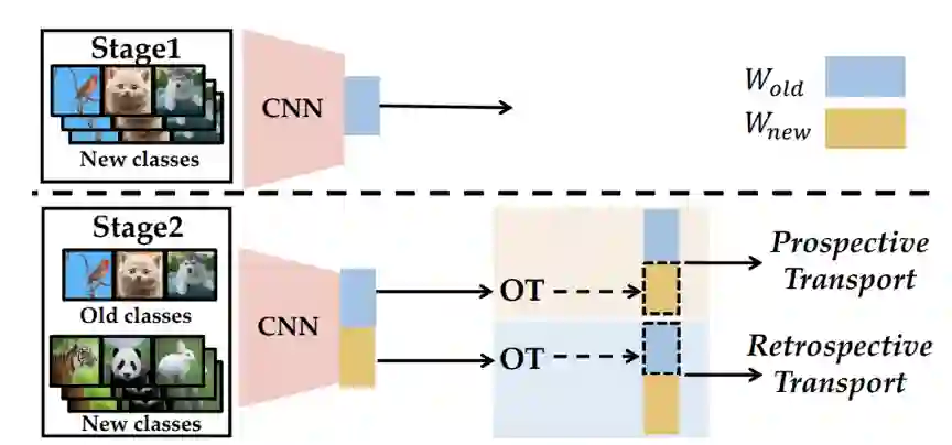 经典的学习系统往往被部署在封闭环境中,学习模型可以利用预收集的数据集对固定类别的数据进行建模。然而,在开放动态环境中这种假设难以满足——新的类别会随时间不断增长,模型需要在数据流中持续地学习新类。例如,在电商平台中,每天都会新增多种产品;在社交媒体上,新的热点话题层出不穷。因此,类别增量学习模型需要在学习新类的同时不遗忘旧类别的特征。本文观察到在增量学习的过程中,新类和旧类间存在相关性,因此可以利用它来进一步地辅助模型在不同阶段的学习。因此,本文提出利用协同运输辅助类别增量学习过程,并基于类别间的语义相关性将不同的增量学习阶段联系起来。协同运输分为两方面:向前运输(prospective transport)旨在利用最优运输获得的知识增广分类器,作为新类分类器的初始化;向后运输(retrospective transport)旨在将新类分类器转化为旧类分类器,并防止灾难性遗忘。因此模型的知识可以在增量学习过程中双向流动,从而在学习新类的同时保持对旧类的判别能力。