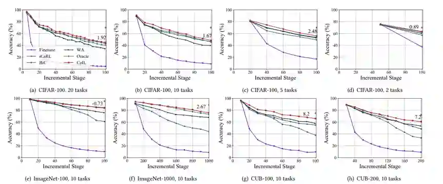 本文提出的COIL方法在多个基准和多媒体数据集上进行了测试。如图3所示,实验结果表明COIL具有更好的分类性能与更少的灾难性遗忘。图4的分类边界可视化表明,利用语义指导的分类器重用能够有效地迁移分类器,甚至无需训练也可以构造有效的分类边界。