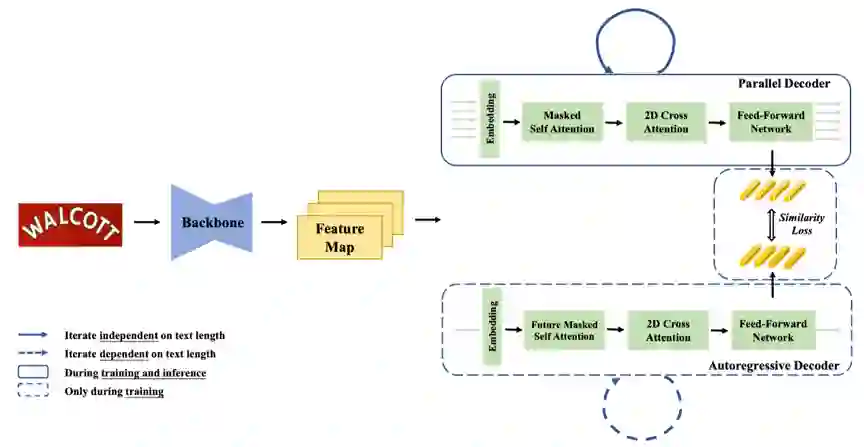 目前,场景文本识别因其广泛的应用而受到越来越多的关注。大多数最先进的方法采用基于注意机制的编码器-解码器框架,通过自回归的方式从左到右生成文本。尽管性能较好,但由于采用逐个解码策略,速度有限。与自回归模型相比,非自回归模型预测结果的并行推理时间要短得多,但其准确性大大低于自回归模型。在本文中,我们提出了一个并行、迭代和模仿学习的网络(PIMNet)来平衡准确性和效率,网络结构如图1所示。具体来说,PIMNet采用并行注意机制更快地预测文本,采用基于“简单优先”策略的迭代生成机制使预测更准确。在每次迭代中,上下文信息将被充分地探索。为了提高隐藏层的学习能力,我们在训练阶段采用模仿学习,增加一个自回归解码器分支,并行解码器来拟合自回归解码器隐藏层的输出。由于两个解码器之间共享骨干网络,所提出的PIMNet可以不经过预训练就进行端到端训练。在推理过程中,为了更快的速度,自回归解码器的分支被删除。在公共基准上的广泛实验证明了PIMNet的有效性和效率。