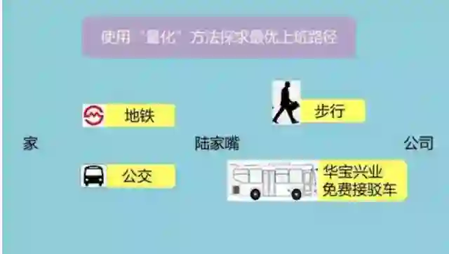 例如,某魔都金融民工,每日上班路线是这样的:乘地铁或者公交至陆家嘴,随后步行或者乘华宝兴业免费接驳车至公司楼下。哪条路线最近呢?