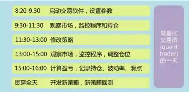 具体来说,如何进行量化投资?我们来看一位量化交易员(quant trader)的一天: