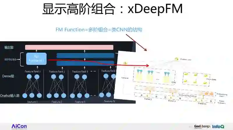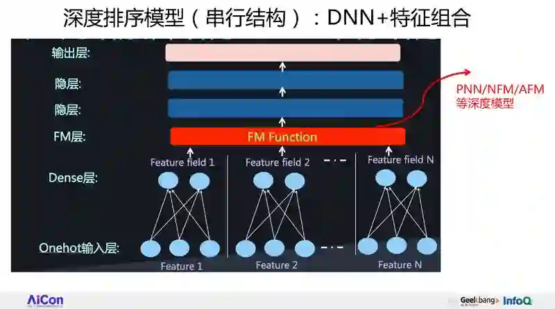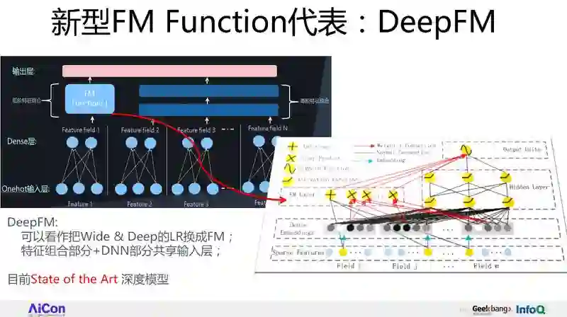 第一条路线,新型的 FM Function,就是怎么能够设计一个新的结构,FM Function 更有效地捕获二阶特征组合,比如说典型的 Wide&Deep,DeepFM,NeuralFFM 就是用来做这个的。