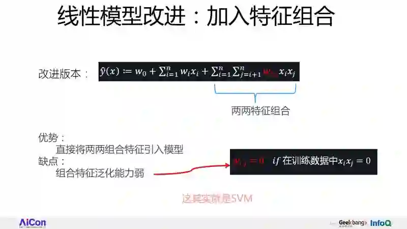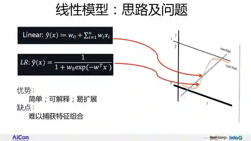 那么线性模型有什么优点和缺点呢?因为它简单,所以好理解,上线快,速度快,这是它典型的优点。尽管我们到了深度学习时代了,但事实上,很多公司还在用 LR,因为它确实很好用。但它也有问题,我刚才讲了一句话:所有的 CTR 模型,核心是特征组合,但是上图的公式里看不到任何特征组合的迹象:单个特征配置权重,特征间的关系没有被发现,这就是 LR 最大的一个缺点。线性模型有这个问题,它不能够捕获特征组合,所以要改造一下这个公式,把特征组合揉进来。