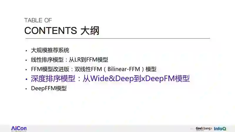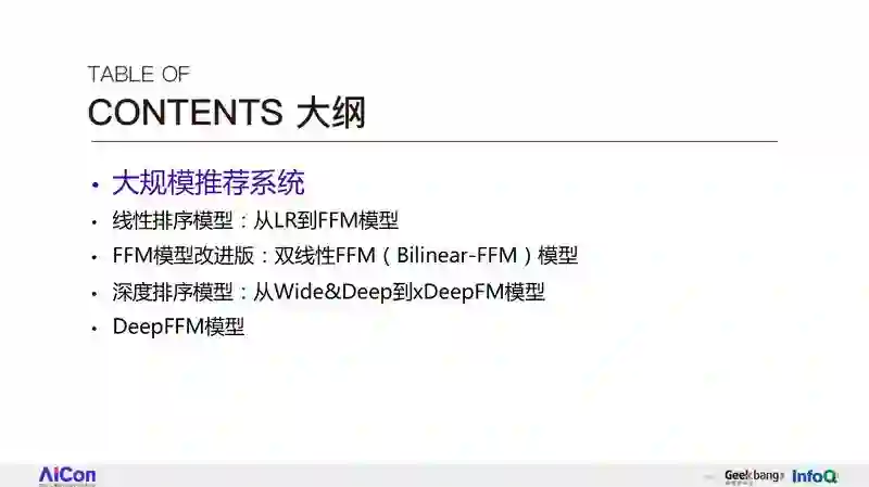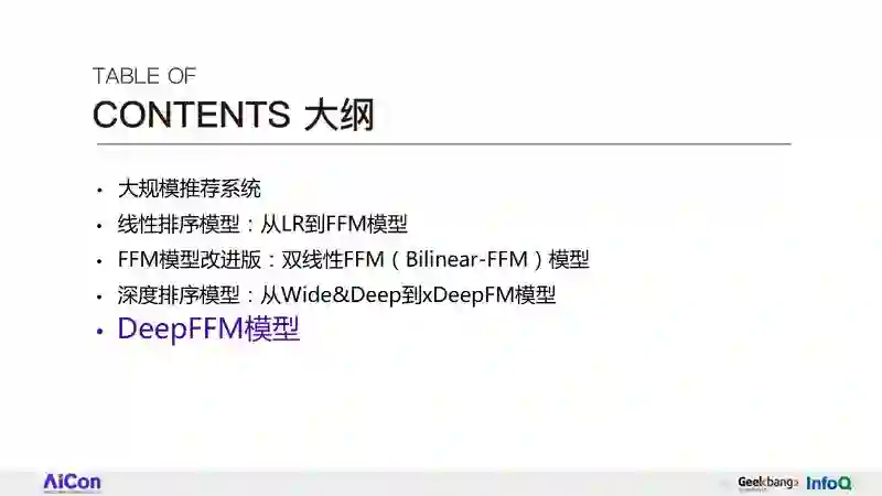 今天我们主要介绍一下,FFM 和它的深度学习模型版本。今天我要跟大家分享的一个大的提纲。