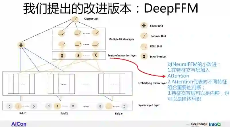 我们这个 DeepFFM 是怎么改进的呢?在特征交互层,也就是两两特征在这组合,我们加了一个 Attention,也就是一个注意力模型进去。我认识两两特征组合,但是有的组合特征比较重要,有的没那么重要,怎么体现这个思想?给每个特征组加个权重就可以。怎么给权重?加个 Attention 就可以了。这就是我们 DeepFFM 的核心思想。