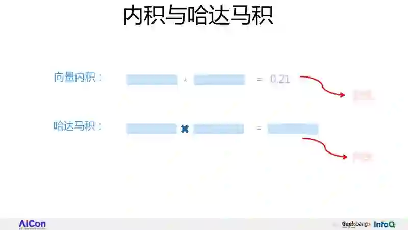但是这里有个变化点。两个特征进行组合的时候,可以用内积做,也可以用哈达马积做,这是有区别的。什么是内积呢?就是两个向量,每个位置对应的相乘求和,表示一个数值;哈达马积怎么做的呢?它比内积少做了一步,把对应的位置相乘,乘完之后不进行求和。