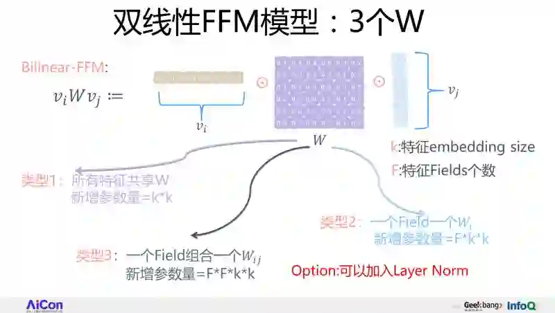 因为每个特征现在有 F 个 vector 来表示它的参数空间,因为 F 个 vector 是跟随每个特征增长的,由于特征数是非常大的,所以它的参数量很大。能不能把跟特征走的抽出来,大家一起用这个参数,如果你一起用的话,能够共享这个参数,你就能把参数量降下来,这就是我们讲的双线性 FFM 的核心思想。vi,vj 还是跟 FM 一样,还是用一个 vector 来表达,但是把两个交互的复杂特性放在大家共享参数里面去学,这就是双线性 FFM 的核心思想。