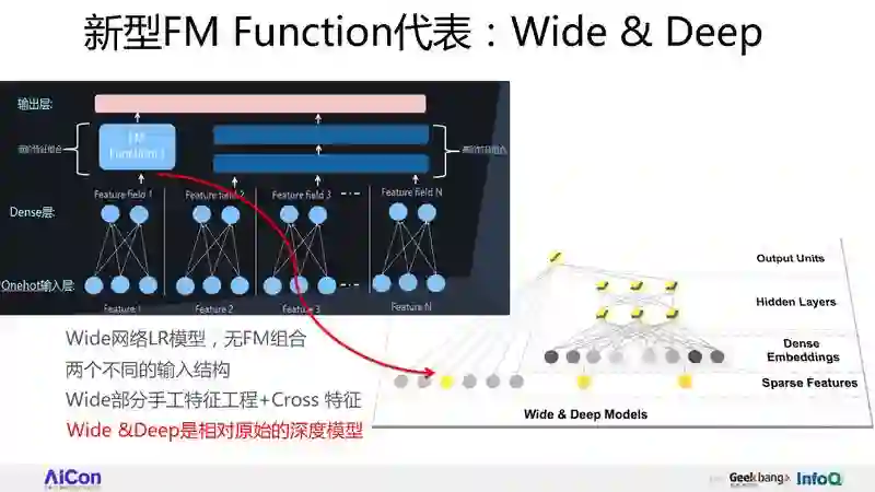 Wide&Deep 的结构是什么呢?实际上就是我画的并行结构,右边就是 DNN 部分,左边的 FM Function 用的是线性回归。我个人认为,Wide&Deep 是相对原始的模型,LR 有的问题它也有,特征组合需要人去设计,Wide&Deep 也有这样的问题。