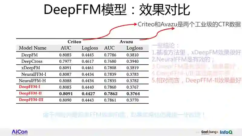 DeepFM,我们实际测过,想做高是不容易的;xDeepFM 是 3 个技术模型中最好的,所以新模型想比原模型高很多是很难的;NeuralFM 和 DeepFM 在这个数据集上并没有很大提高,比原来稍有提升一点,但是在 Avazu 上是有明显提升的;DeepFFM 什么效果呢?下面标红这三个,尤其是第二个模型做到 0.8091,也就是说在所有的模型里面效果最好的,在 Avazu 来说也是效果最好的。