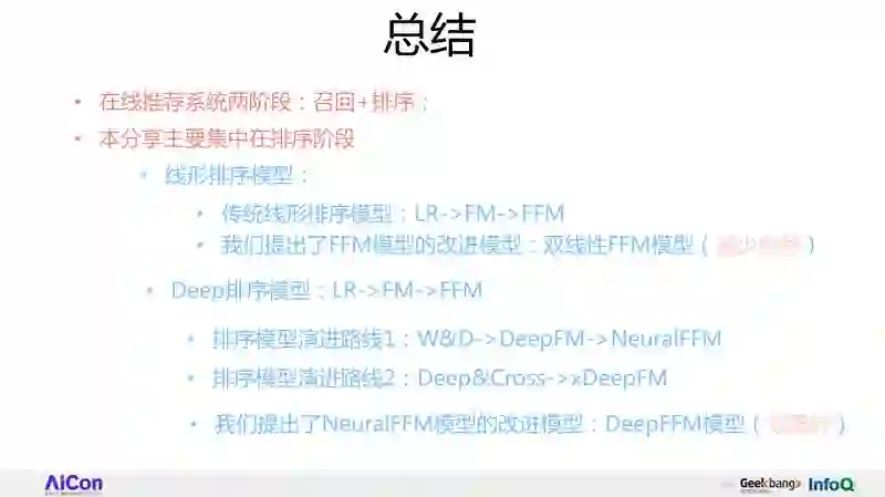 今天讲了大规模系统是怎么构成的:包括召回加 ranking,我们的主要内容放在 ranking 阶段;之后,我回顾了一下线性模型,重点提到了双线性模型,它的特点是可以在参数量极小的情况下,性能达到类似于 FFM 的效果;然后,我给大家分享两个深度模型的演进路线,一样的改进版本,效果目前来看还是比较好的。