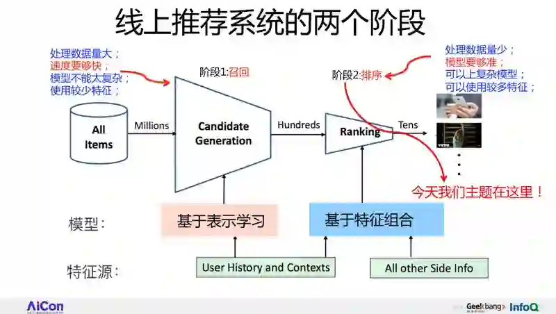 我刚才说了三个过程:召回、粗排、精排,但是最常见的还是两个阶段的,就这张图展示的。
