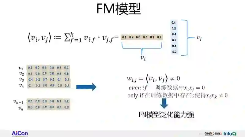 但是换成 FM 模型就可以解决这个问题。在训练集里面没有见过 xi,xj 的组合,没有关系,xi 要学一个 embedding,不需要依赖 xj 的存在,它自己可以学出 embedding 来。在现实场景中遇见了这个特征组合,用那两个点积不会是 0,这就代表有效地赋予它权重,同时也说明了为什么 FM 泛化能力更强。