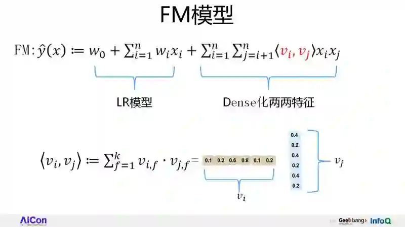 前面还是一样,就是 LR 模型,后面的也是任意两个特征组合,和刚才公式唯一的区别在:原先的 wi,j,换成了 vi 和 vj 的点积。vi 和 vj 又是什么含义呢?vi 的意思:对于 xi 这个特征来说它会学到一个 embedding 向量,特征组合权重是通过各自的 embedding 的内积呈现的,因为它内积完就是个数值,可以代表它的权重,这就是 FM 模型。