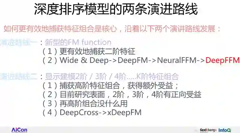 如果再归纳一下,你会发现深度排序模型,现在有朝两个研究路线在走。所有的模型在干什么?捕获特征组合是它的核心,这两条演进路线怎么走的呢?