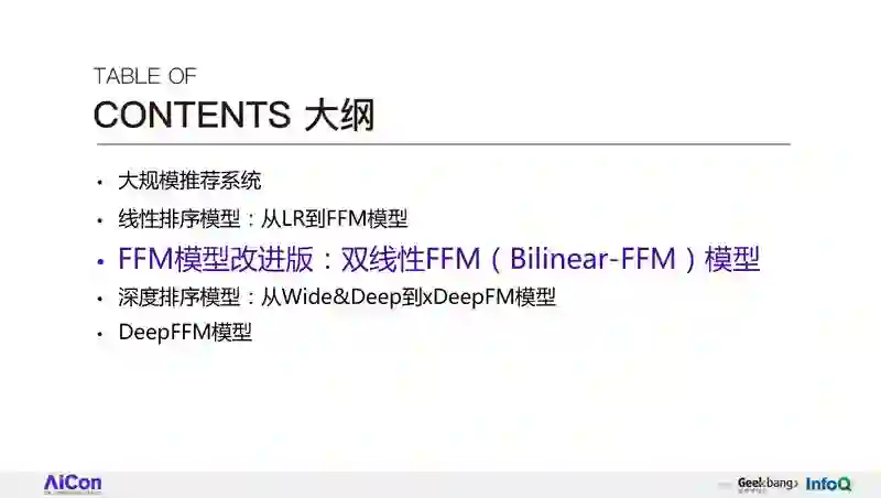 第三,FFM 模型有它的优点,也有它的问题,所以针对它的问题,我会介绍一个改进的版本,叫双线性的 FFM 模型。
